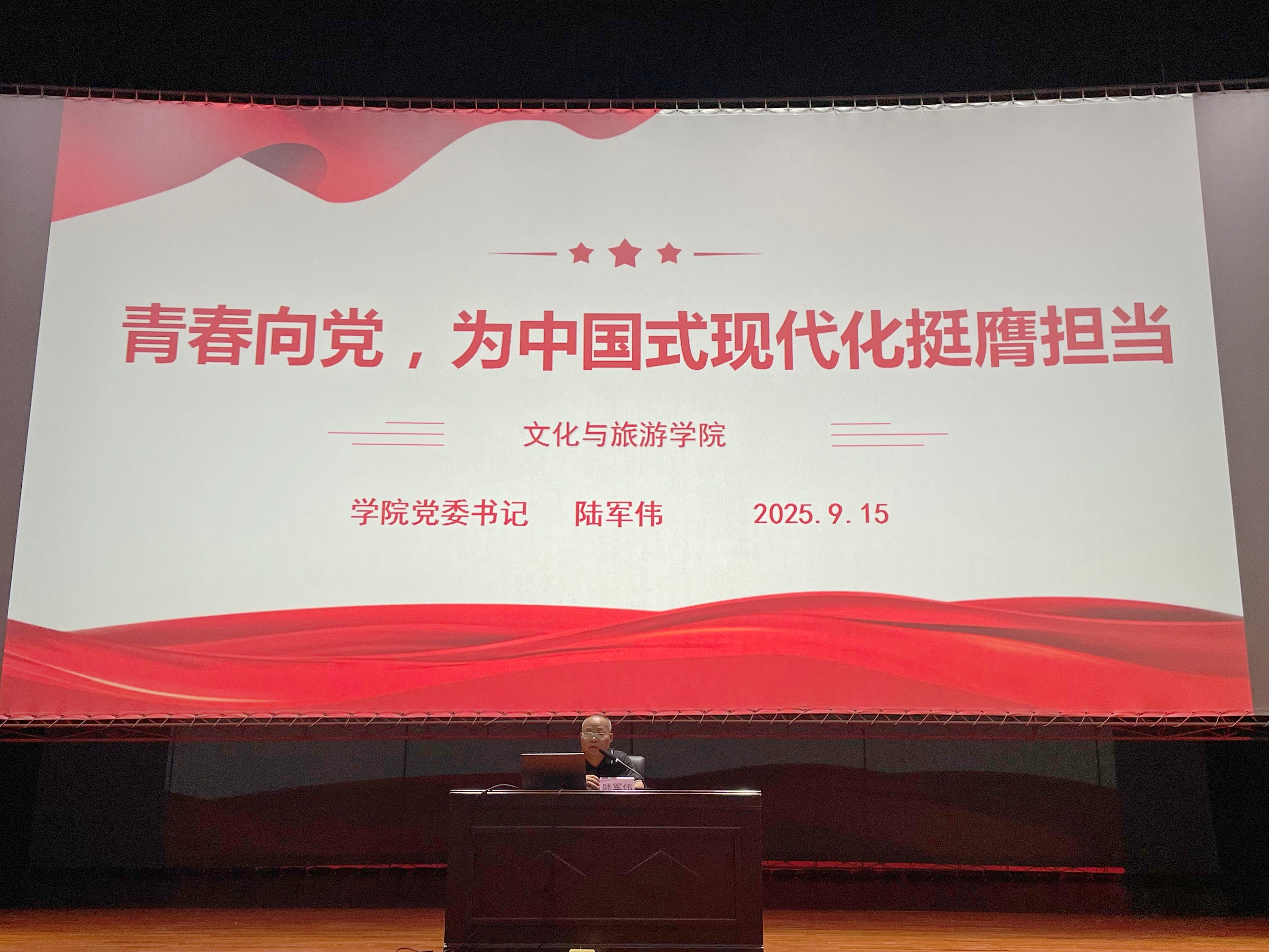2025年9月15日,文化与旅游学院在学校会议中心大礼堂举行“新时代文明实践所”理论宣讲活动,由文化与旅游学院党委书记陆军伟主讲题为《青春向党,为中国式现代化挺膺担当》的党课,学院教职工和新生参加了此次宣讲活动。
