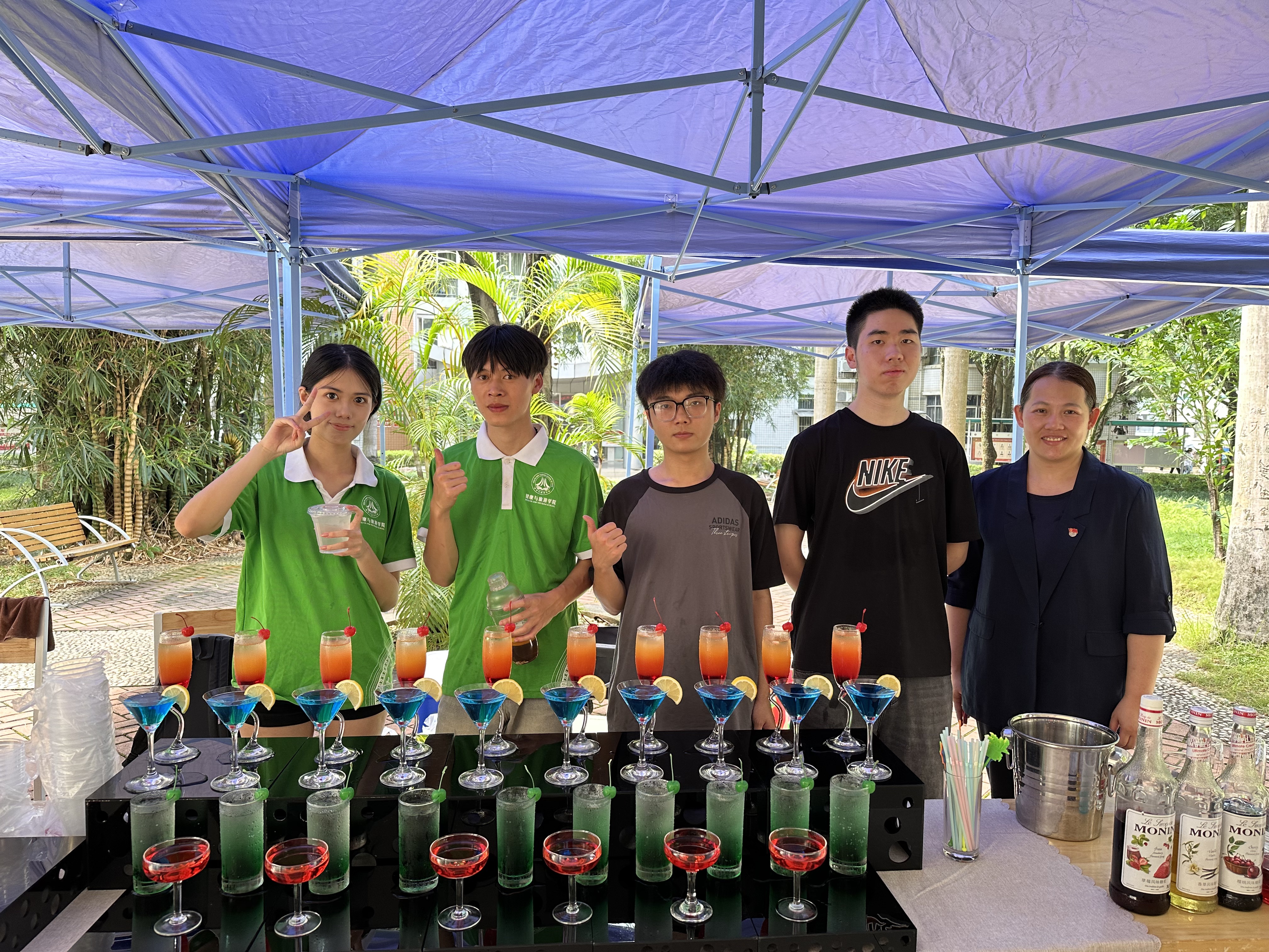 酒店管理与数字化运营专业(桂港合作办学班)学生在第一实训楼前举行专业文化建设暨迎新专业技能展示活动。展示区人气高涨:调酒区志愿者娴熟演绎基酒调配与创意装饰,搭配趣味讲解展现现代饮品技艺;茶艺调饮区茶香与果香交织,新生品尝着现场制作的柠檬红茶、椰椰水,感受传统茶饮创新表达;咖啡区陈列着多款精心预制的特色咖啡,志愿者同步讲解咖啡豆甄选、风味分类与咖啡文化知识,醇厚香气萦绕展区,让新生在品味与聆听中走近咖啡领域;插花区志愿者将亲手制作的祝福花束赠与新生,让入学时刻满含仪式感。同时,我院易班工作站在现场设置了充满创意的拍照打卡点。新生们纷纷在打卡点前拍照留念,记录下这一重要时刻。