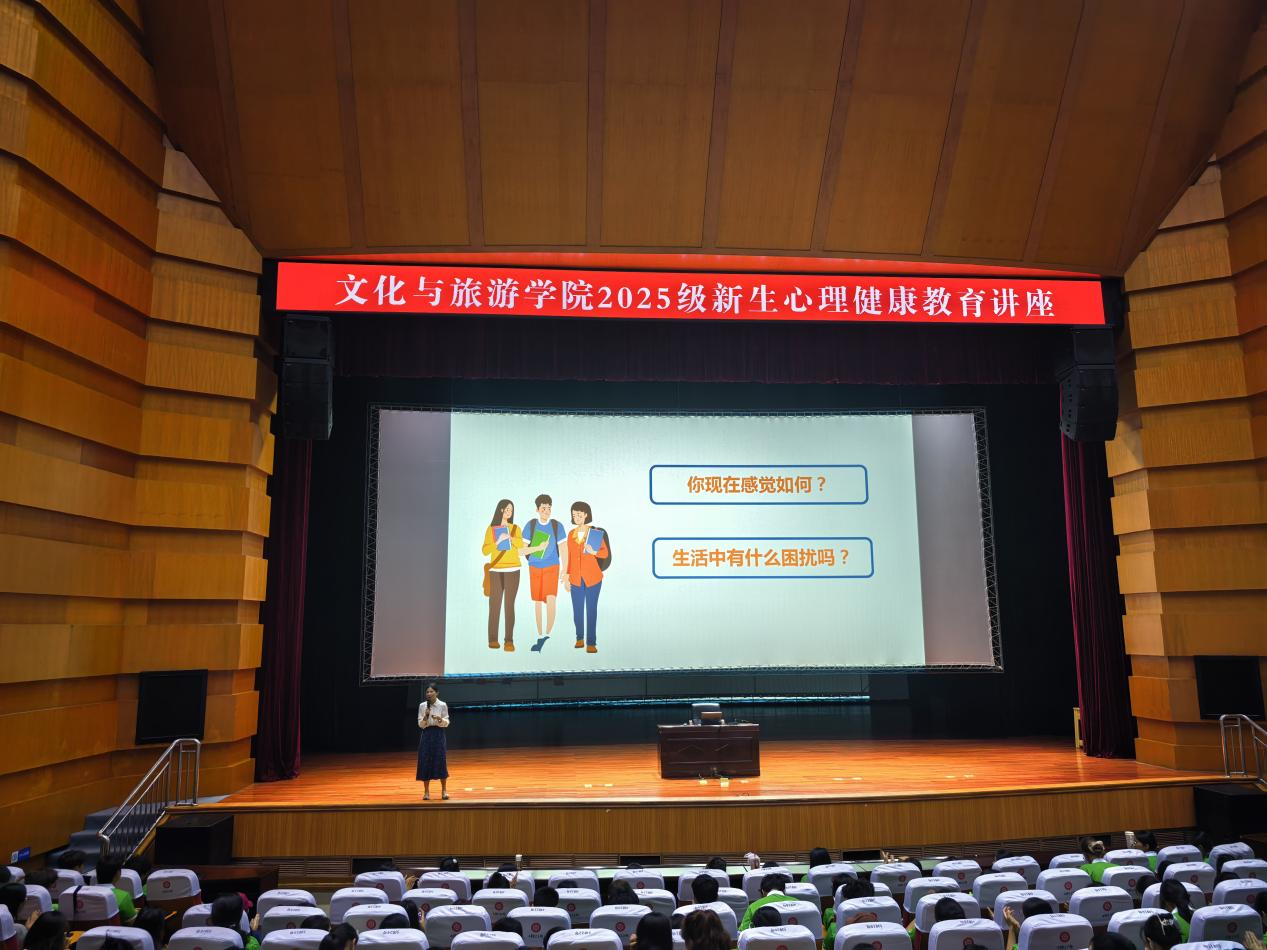 为有效预防2025级新生入校后可能产生的适应障碍、焦虑等常见心理问题,提升学生的心理韧性和自我调适能力,培养自尊、自信、理性、平和的健康心态,文化与旅游学院邀请广西财经学院心理健康教育与咨询中心副主任覃梅芳于2025年10月17日晚在学校会议中心1号厅开展了主题为“心光领航,适应有方”的心理健康教育讲座,学院2025级全体新生参加。