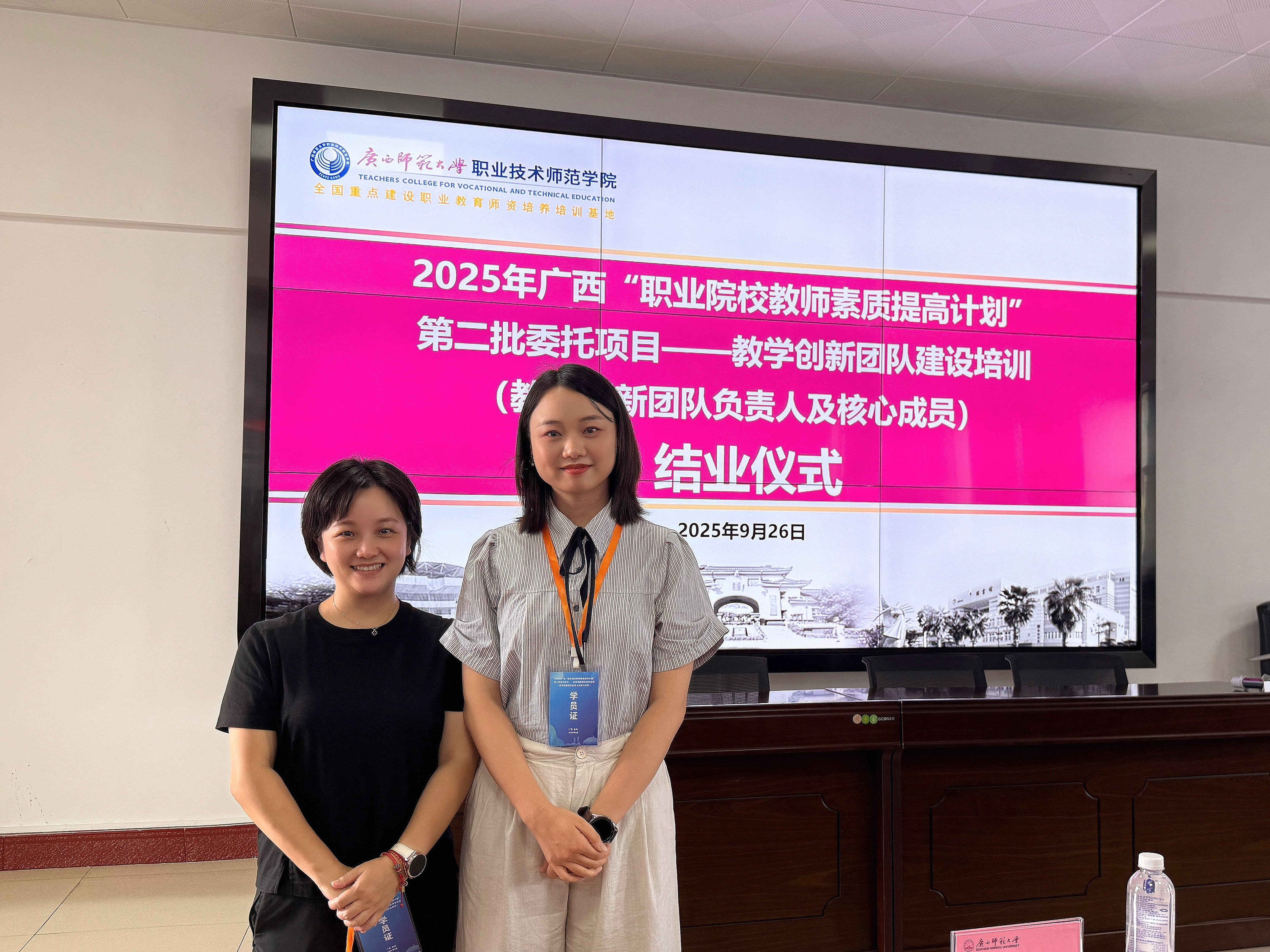 2025年9月16日至26日,文化与旅游学院酒店管理专业骨干教师吴诗源与何兰兰参加由广西壮族自治区教育厅主办的“2025年广西‘职业院校教师素质提高计划’第二批委托项目——教学创新团队建设培训”。本次培训聚焦教育家精神、课程思政、团队建设等关键内容,并围绕职业院校“五金”建设探索与实践展开深入交流,为职业院校内涵建设与高质量发展指明了方向。参加培训的对象为自治区级职业教育教师教学创新团队负责人及核心成员。吴...